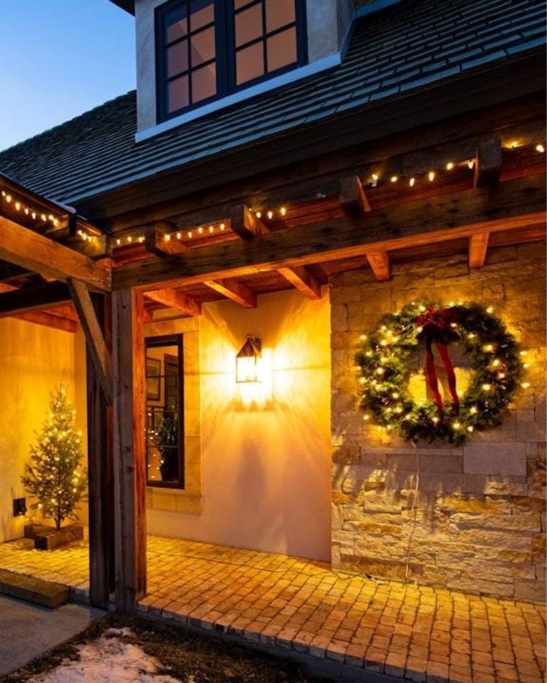 Use simple, elegant holiday decorations such as a wreath, white lights, or evergreen planters.